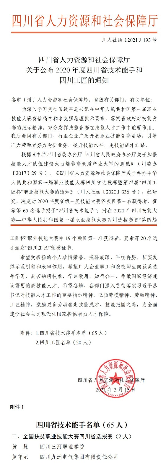 3月15日,四川省人力资源和社会保障厅发布了《关于公布2020年度四川省技术能手和四川工匠的通知》,我校经济管理学院2018级旅游管理专业学生黄慧,被四川省人力资源和社会保障厅授予“四川省技术能手”荣誉称号。