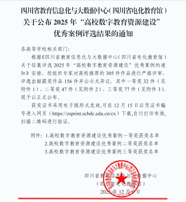 近日,四川省2025年“高校数字教育资源建设”优秀案例评选结果正式揭晓。我校两项案例分别获二等奖与三等奖,充分彰显了我校教师在数字教育资源建设领域的积极探索与示范成效。