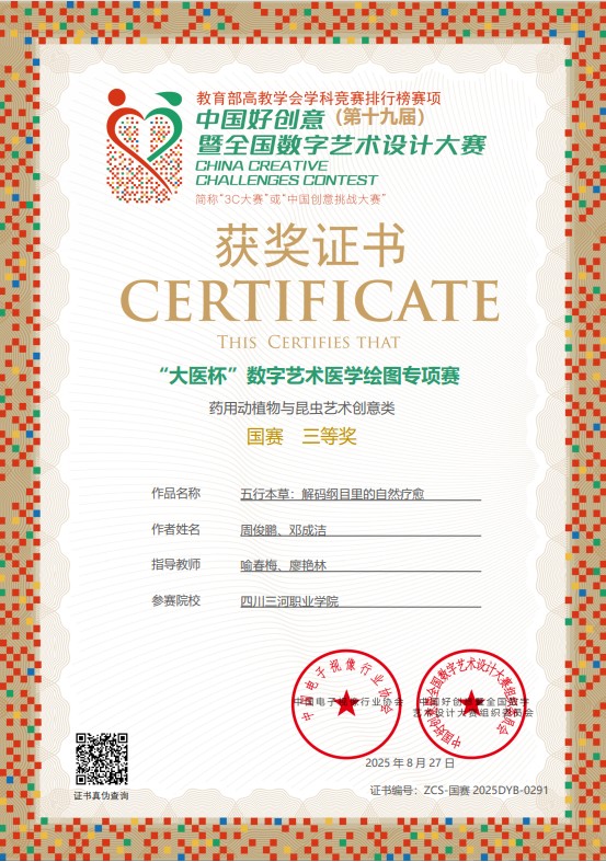 近日,第19届中国好创意暨全国数字艺术设计大赛成绩正式揭晓,四川三河职业学院学生在四川省省赛中荣获优秀奖4项;在全国“大医杯”专项赛总决赛中荣获三等奖1项、优秀奖1项。教师喻春梅、廖艳林获省赛优秀指导教师奖。