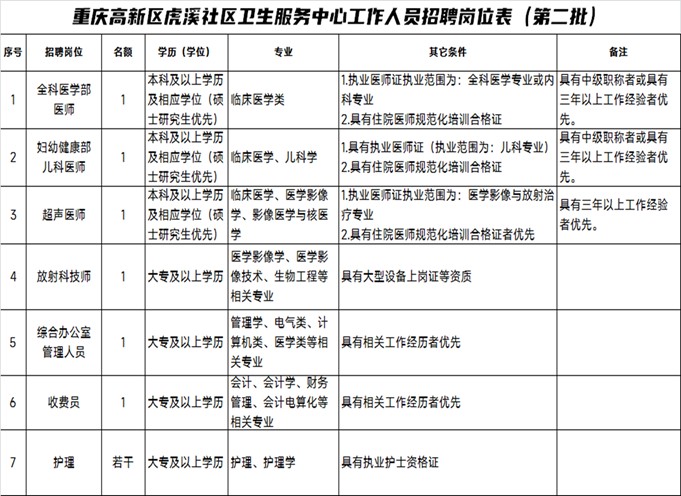 重庆高新区虎溪社区卫生服务中心联合招聘启事(第二轮)