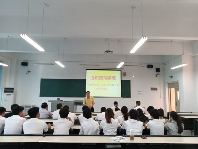 通识教育学院召开“安全生产月”工作专题会议 通识教育学院召开“安全生产月”工作专题会议为深入学习习近平总书记关于安全生产的重要论述,全面贯彻落实学校安全工作会议精神。2025年6月13日,通识教育学院在综合教学楼东203教室召开“安全生产月”工