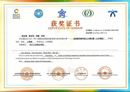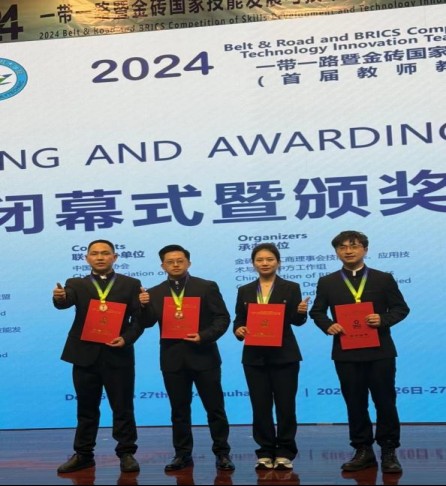 近日,2024 年首届 “一带一路” 暨金砖国家教师教学能力大赛国际总决赛在广东珠海盛大举行。四川三河职业学院通识教育学院信息技术教研室的教师陈志勇、陈忠海、张鹏、朱燕组队参赛。经过三天的激烈角逐与多轮比拼,团队凭借出色的教学设计、扎实的教学功底以及现场汇报展示,在全国公共基础课参赛组别中崭露头角,最终荣获国际总决赛 “铜牌”。