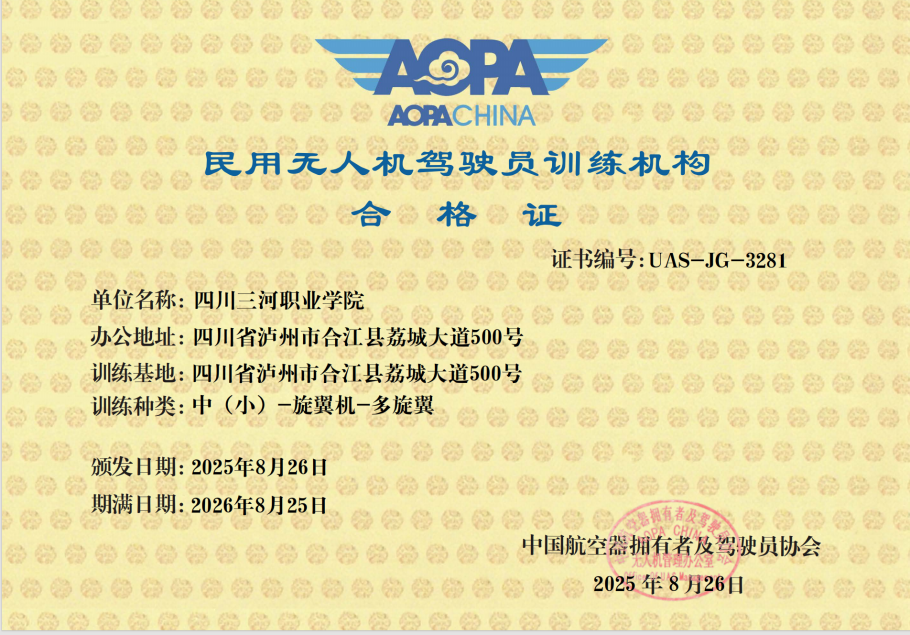2025-09-09 四川三河职业学院再获无人机领域重要资质2025年8月25日,四川三河职业学院喜迎佳讯——成功获得由中国航空器拥有者及驾驶员协会(AOPAChina)颁发的民用无人机驾驶员训练机构合格证。此前,学校已取得中国民用航空局颁发的民用无人驾驶航空器...四川三河职业学院召开2024—2025学年第二学期期末教职工大会