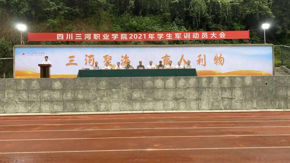 2021-09-02 四川三河职业学院举行2021年学生军训动员大会9月1日上午,四川三河职业学院在博湾运动场举行了2021年学生军训动员大会,合江县委常委、武装部部长、军训团团长郑朝江上校,学校党委副书记、军训团政委王华,学校党委副书记、军训团参谋长邬正福,保...