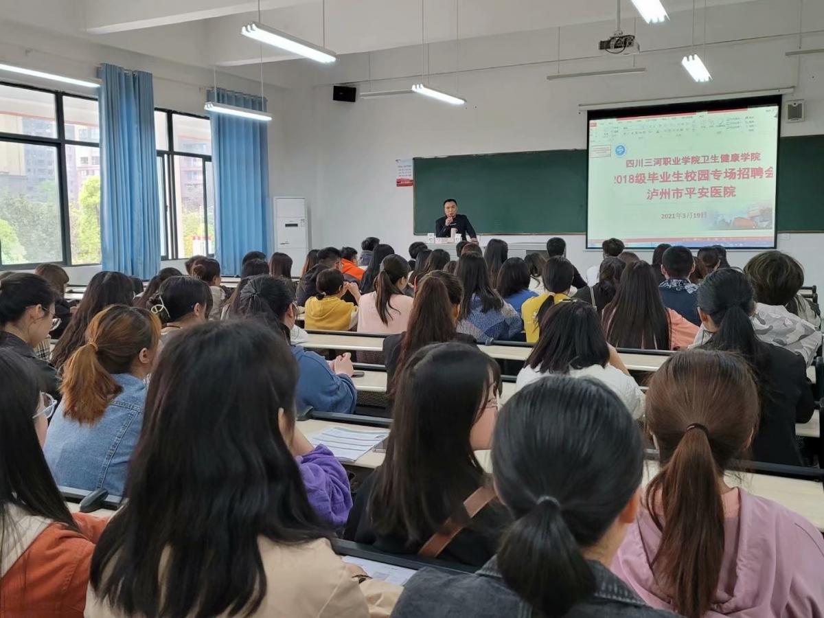 2021-03-20 线上线下多措并举 专场招聘优质就业四川三河职业学院卫生健康学院开展2018级毕业生校园专场招聘会为进一步促进就业,给用人单位和毕业生搭建双向选择的平台,3月19日,卫生健康学院通过线上线下相结合的方式开展了5场专场招聘会。其中泸州平安医院、...