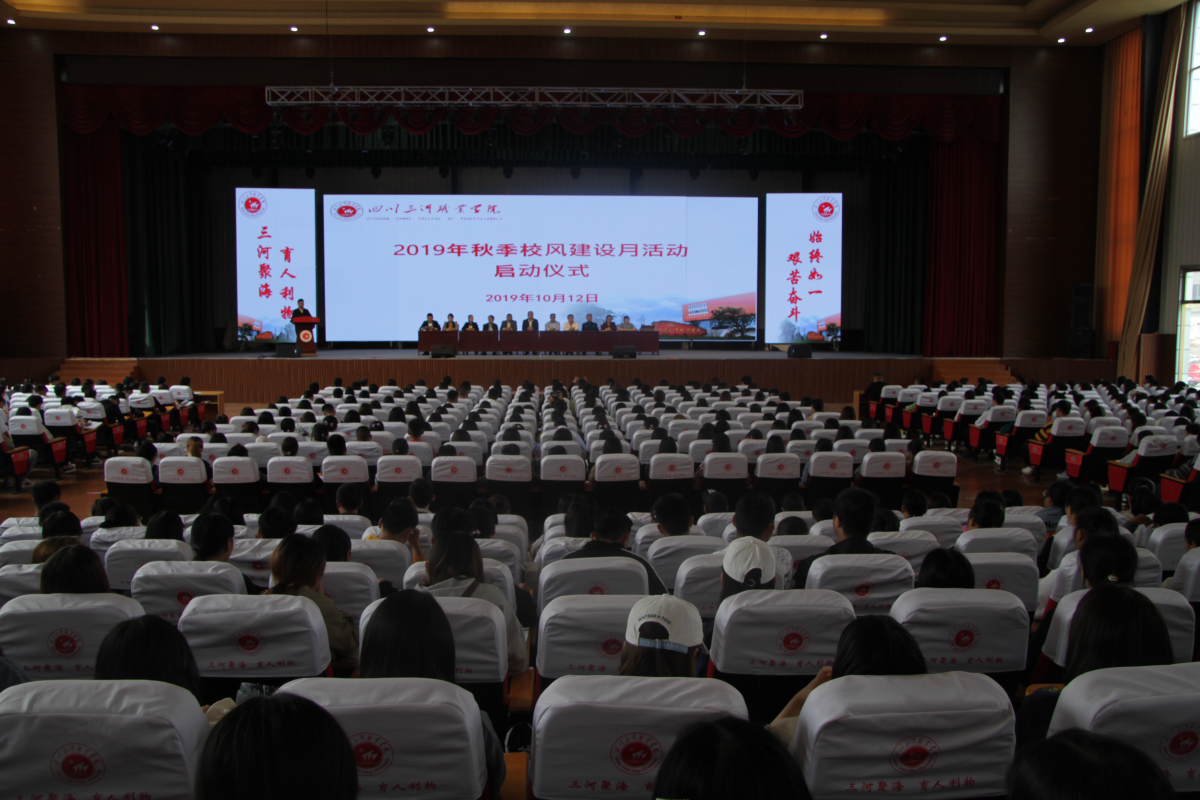 2019-10-25 四川三河职业学院举行校风学风建设月启动仪式 10月12日下午,我校2019年秋季校风学风建设月活动启动仪式在博山礼堂举行,校党委副书记王华、团委书记郭文宇、教务处、学生处等处室负责人出席仪式,各二级学院党支部书记、辅导员以及师生代表10...