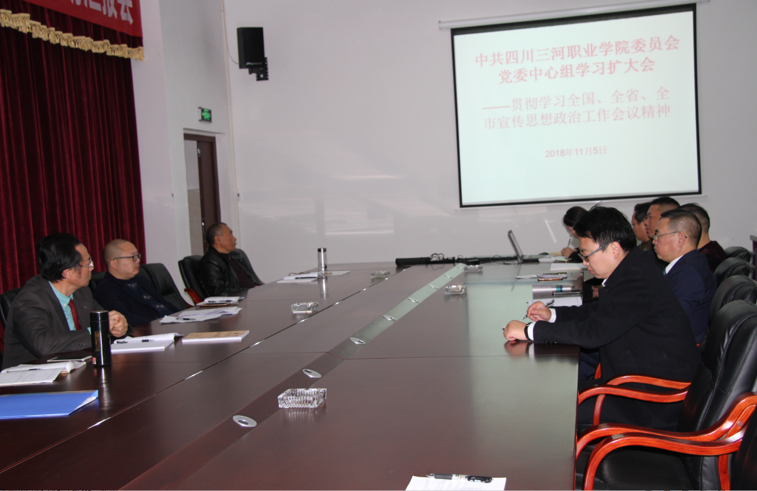 2018-11-05 中共四川三河职业学院委员会召开党委中心组扩大会议 贯彻学习全国、全省、全市宣传思想政治工作会议精神 11月5日,中共四川三河职业学院委员会在行政楼二会议室召开党委中心组学习扩大会议。学院党委书记王文潇、院长彭方弟、副院长苏彬、党委副书记...