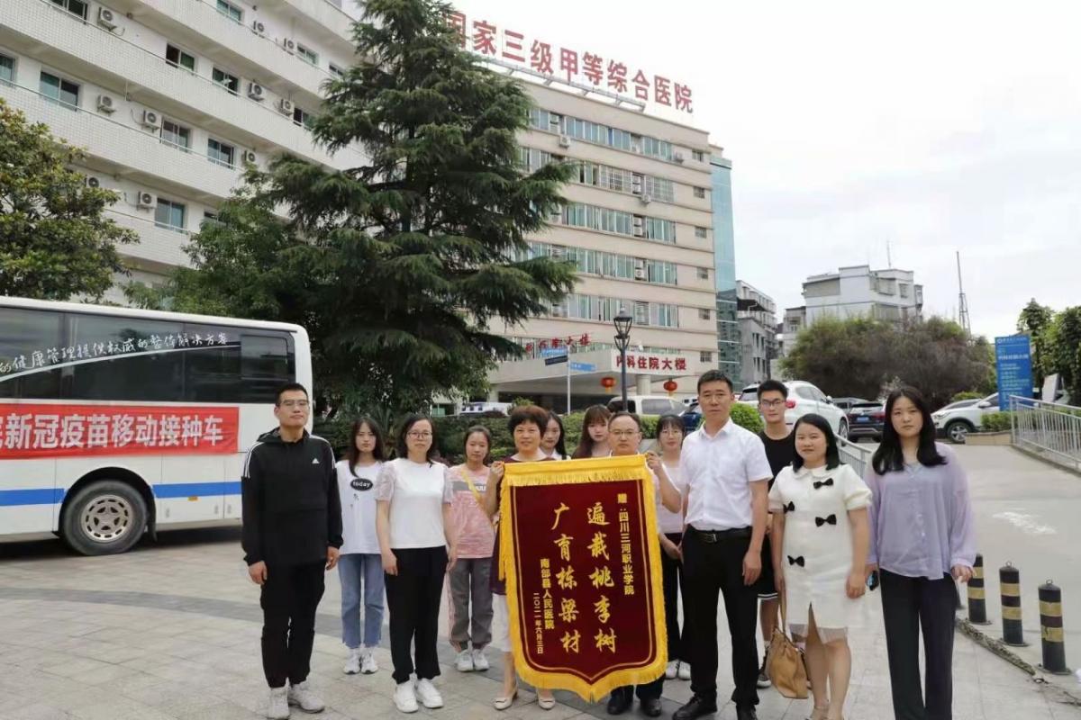 2021-06-05 实习单位送锦旗 校院合作结硕果南部县人民医院向四川三河职业学院赠送锦旗感谢学校输送优秀人才6月3日,四川三河职业学院卫生健康学院党支部书记杨杰一行护送2019级部分学生到南部县人民医院(国家三级甲等综合医院) 进行临床实习报到,医院热情接待...