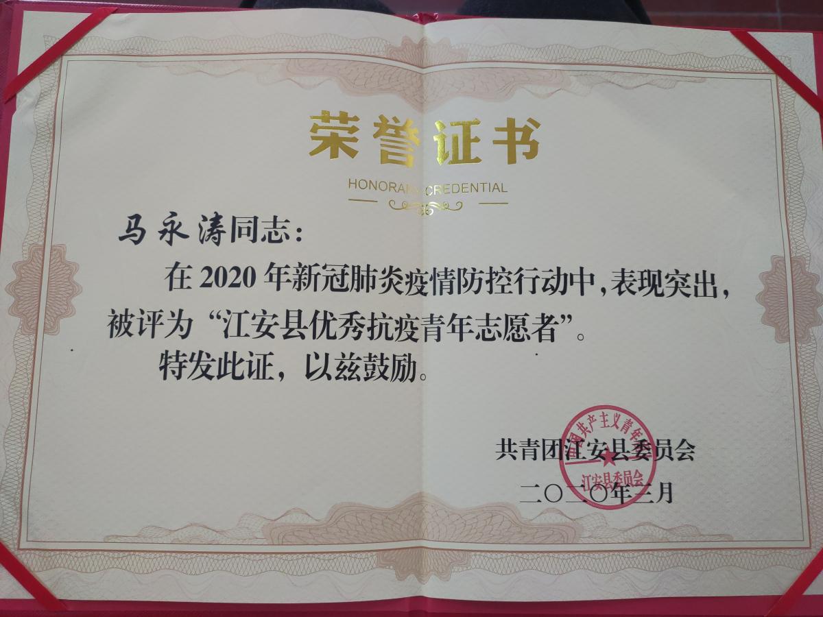 四川三河职业学院建筑工程学院马永滔同学被评为“优秀抗疫青年志愿者”