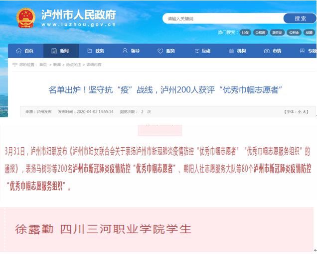 学前教育学院徐露勤同学获评泸州市新冠肺炎疫情防控“优秀巾帼志愿者”