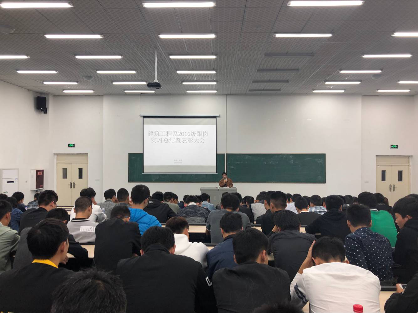 2018-10-29 建筑工程系召开2016级跟岗实习总结表彰会 10月28日19点30分,建筑工程系在综合楼阶梯教室一召开2016级跟岗实习总结表彰会,系党支部书记丁小林,系主任袁林秋,系副主任张柳金,系学办主任兰小华,系学办主任蔡睿和各专业负责人出席本次...
