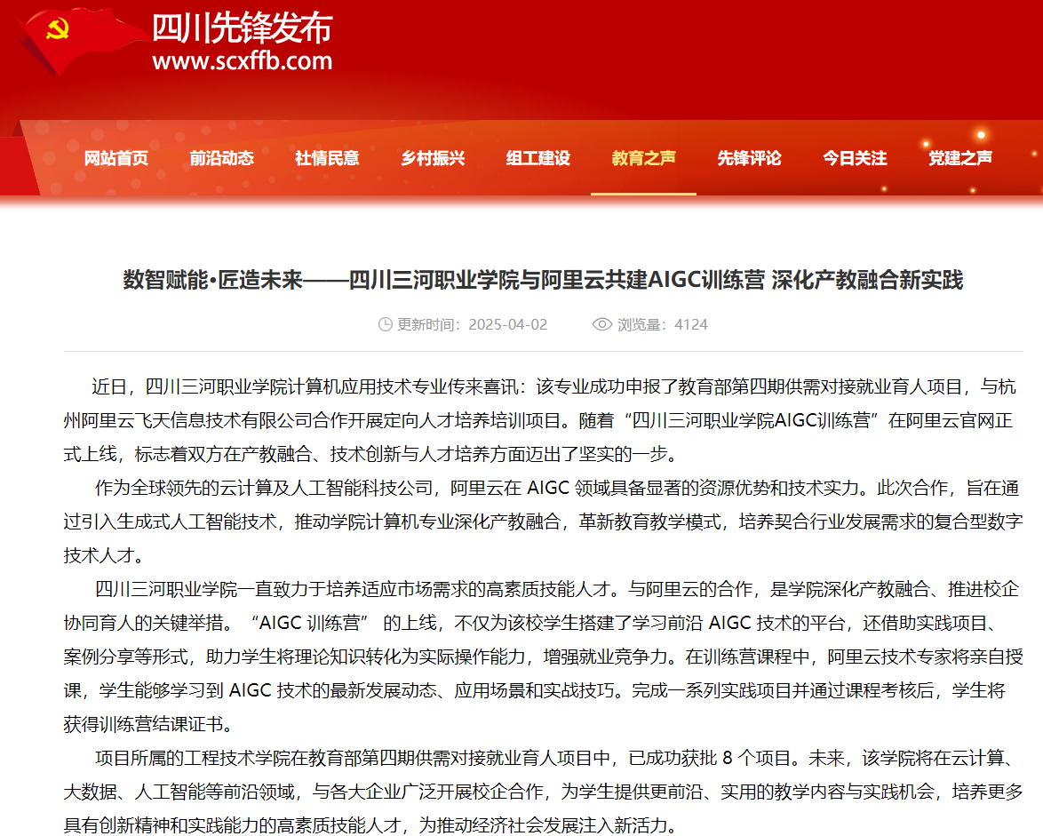 四川先锋发布:数智赋能·匠造未来——四川三河职业学院与阿里云共建AIGC训练营 深化产教融合新实践