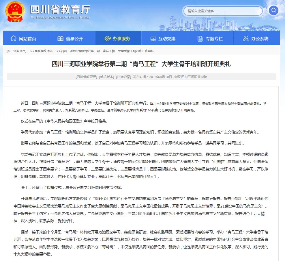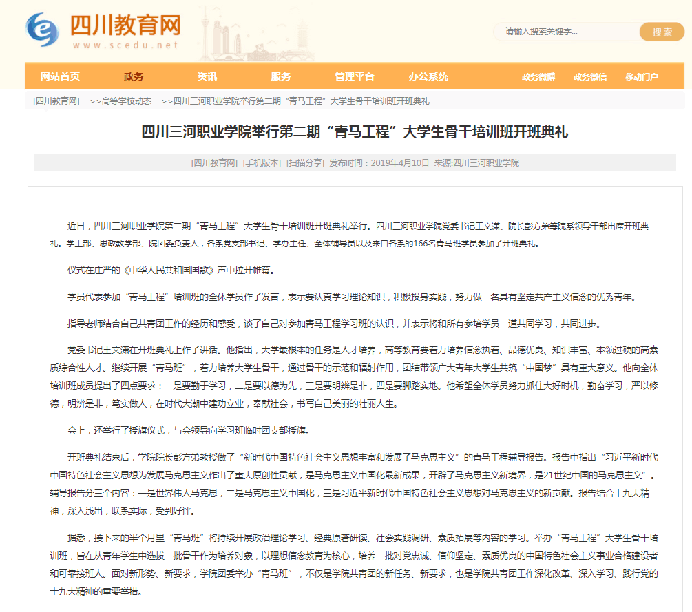 四川教育网:四川三河职业学院举行第二期“青马工程”大学生骨干培训班开班典礼