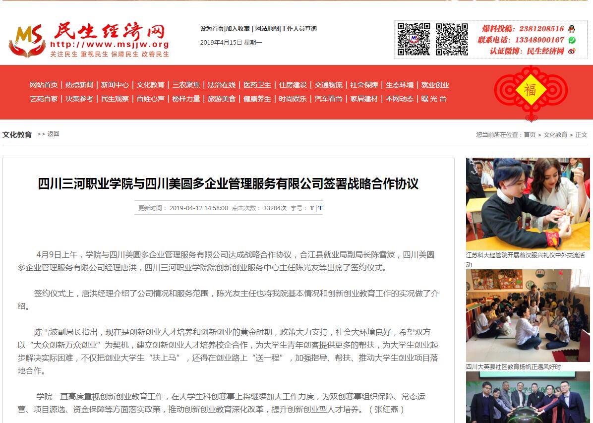 民生经济网:四川三河职业学院与四川美圆多企业管理服务有限公司签署战略合作协议