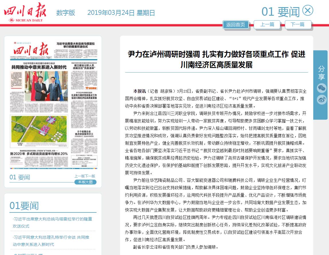 四川日报报道:四川省委副书记、省长尹力赴泸州市调研,莅临四川三河职业学院调研扶贫专班开办情况