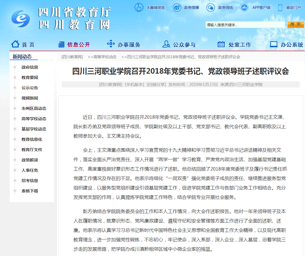 四川省教育厅官网:四川三河职业学院召开2018年党委书记、党政领导班子述职评议会