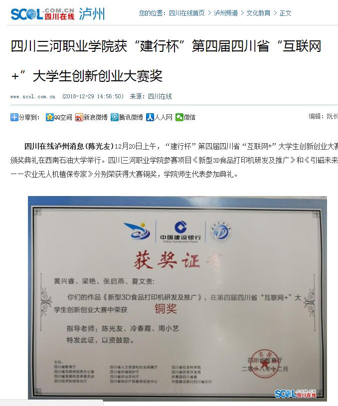 四川在线:四川三河职业学院获“建行杯”第四届四川省“互联网+”大学生创新创业大赛奖