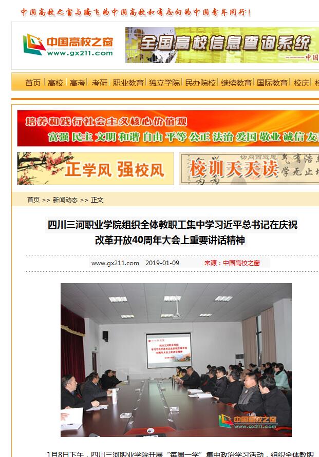 中国高校之窗:四川三河职业学院组织全体教职工集中学习近平总书记在庆祝改革开放40周年大会上重要讲话精神