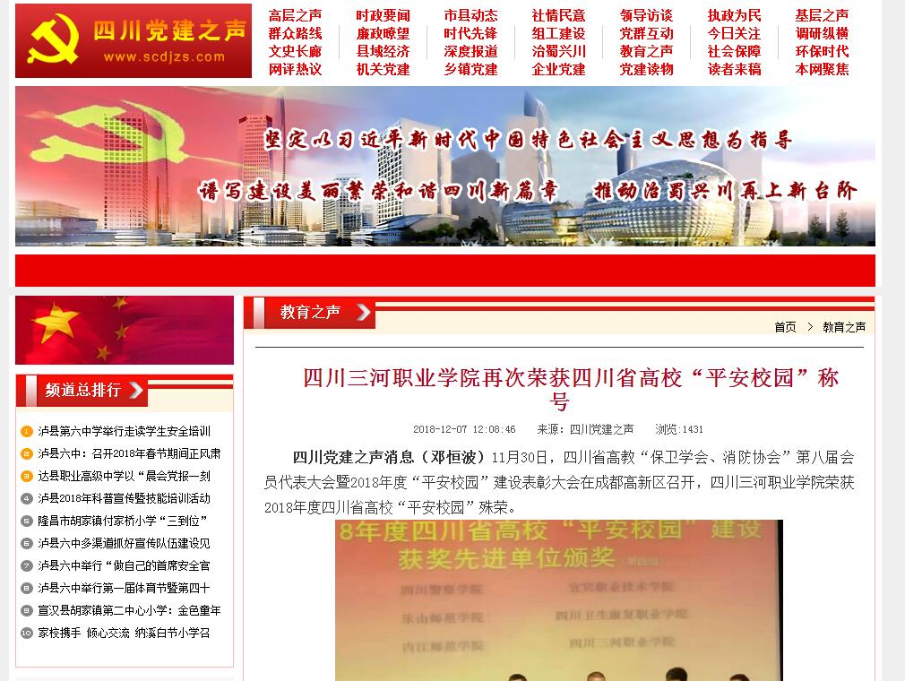 四川党建之声:四川三河职业学院再次荣获四川省高校“平安校园”称号