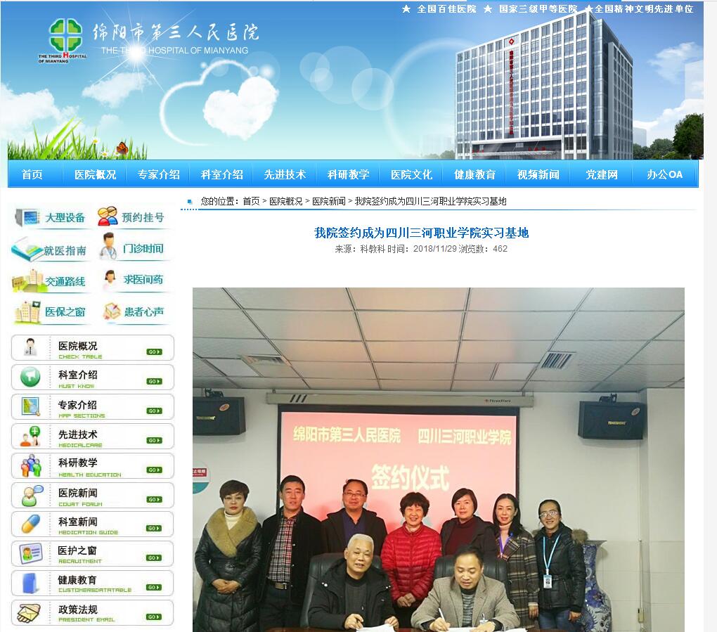 绵阳市第三人民医院:绵阳市第三人民医院院签约成为四川三河职业学院实习基地