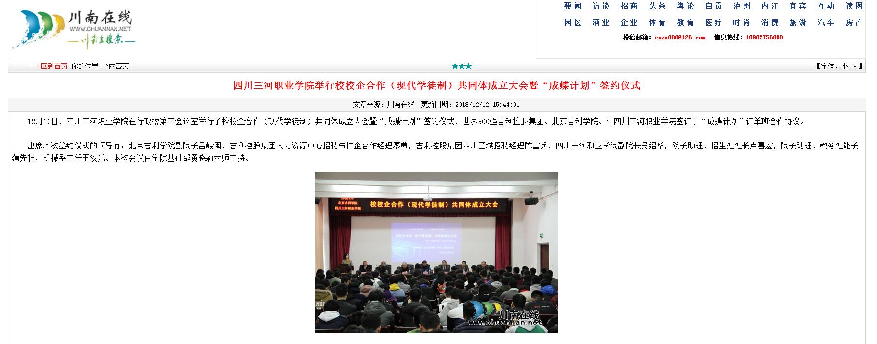 川南在线:四川三河职业学院举行校校企合作(现代学徒制)共同体成立大会暨“成蝶计划”签约仪式