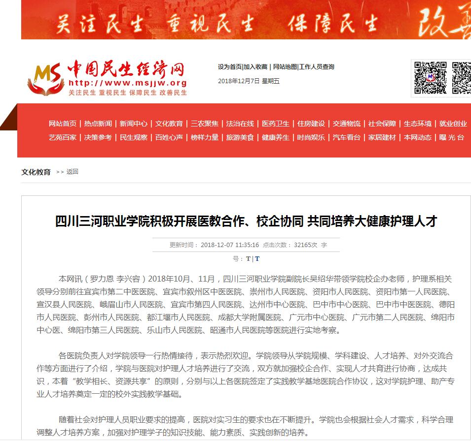 中国民生经济网:四川三河职业学院积极开展医教合作、校企协同 共同培养大健康护理人才