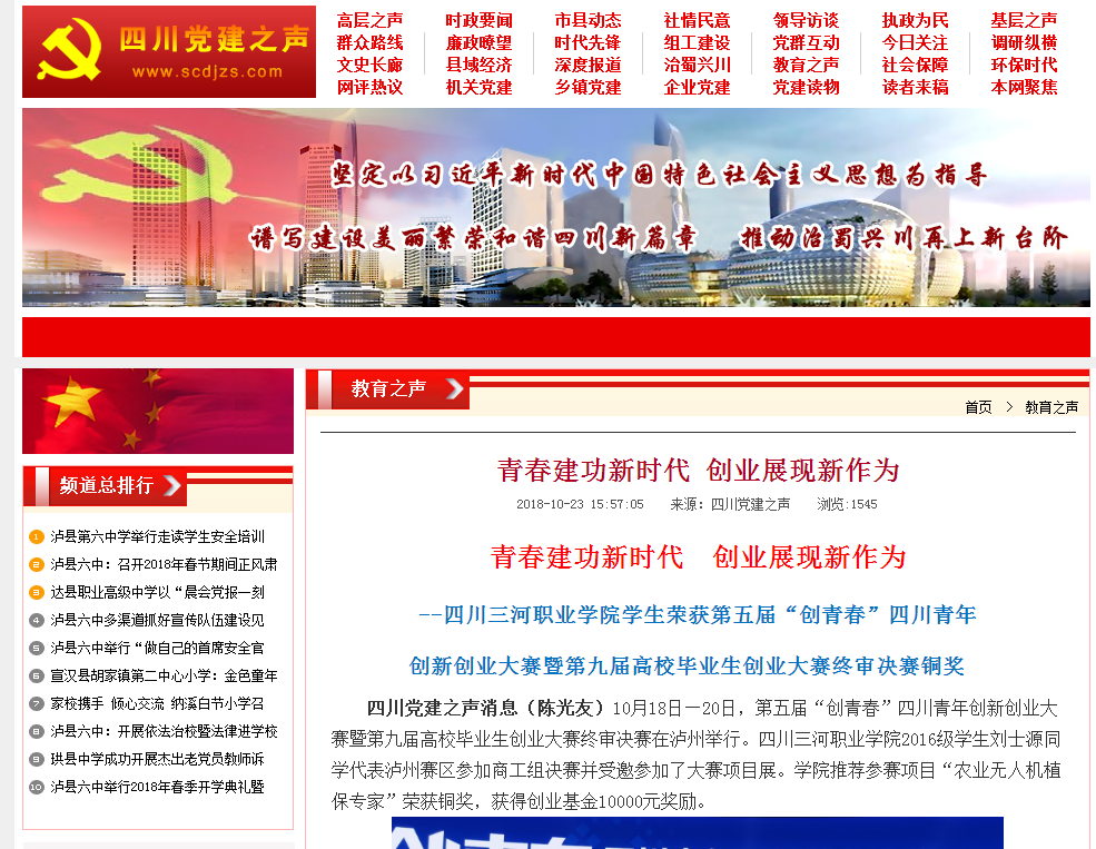 四川党建之声:青春建功新时代 创业展现新作为--四川三河职业学院学生荣获第五届“创青春”四川青年 创新创业大赛暨第九届高校毕业生创业大赛终审决赛铜奖