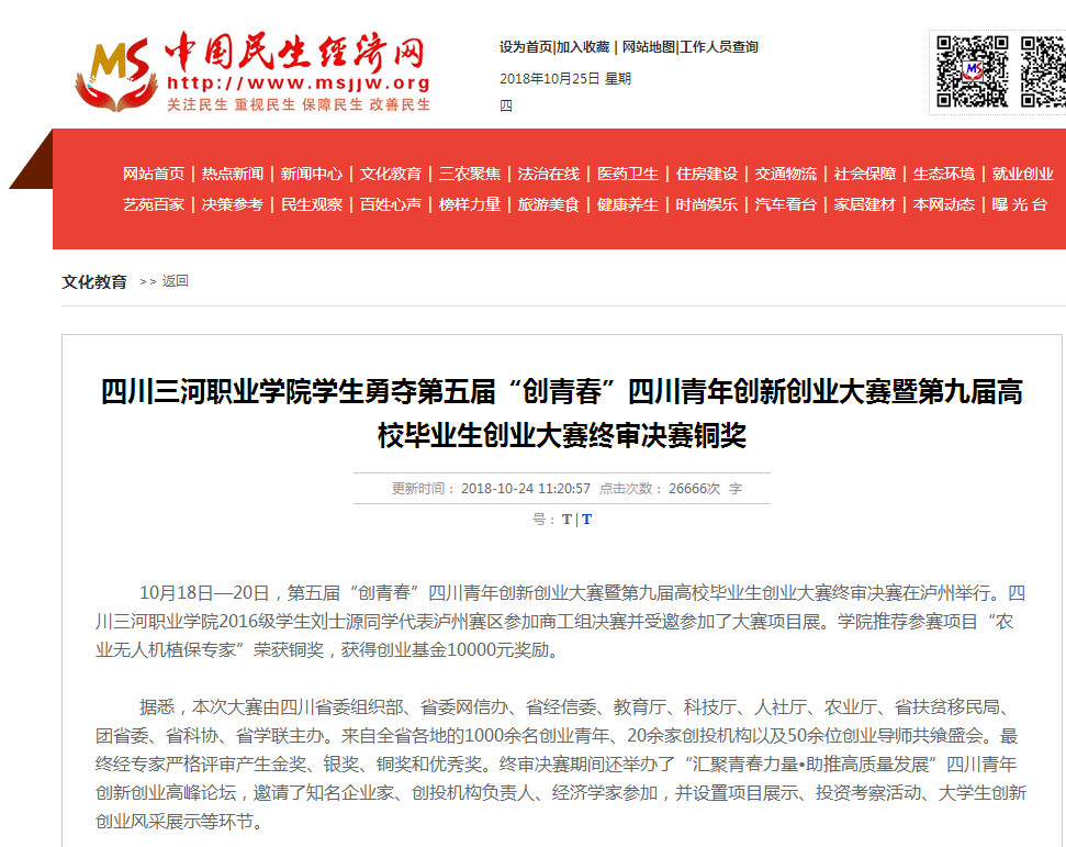 中国民生经济网:四川三河职业学院学生勇夺第五届“创青春”四川青年创新创业大赛暨第九届高校毕业生创业 大赛终审决赛铜奖