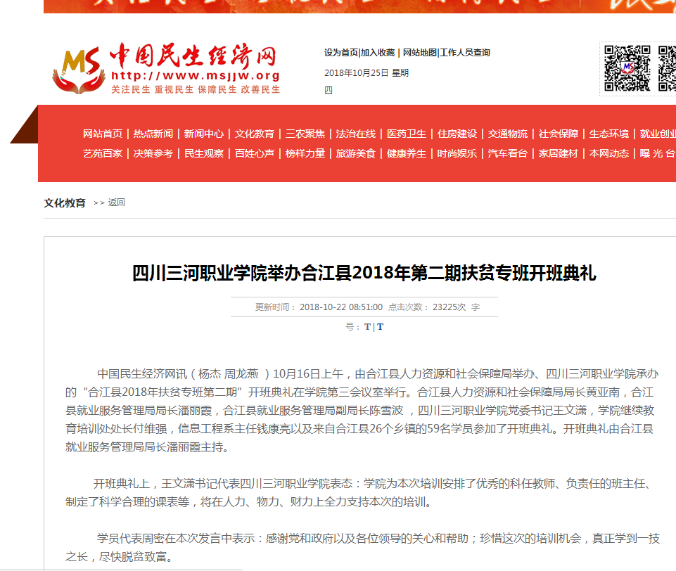 中国民生经济网:四川三河职业学院举办合江县2018年第二期扶贫专班开班典礼