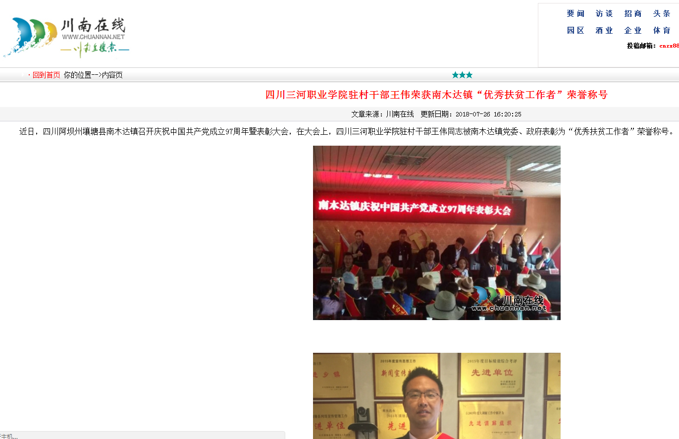 川南在线:四川三河职业学院驻村干部王伟荣获南木达镇“优秀扶贫工作者”荣誉称号