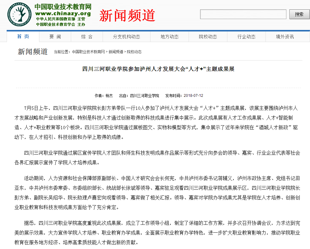 中国职业技术教育网:四川三河职业学院参加泸州人才发展大会“人才+”主题成果展