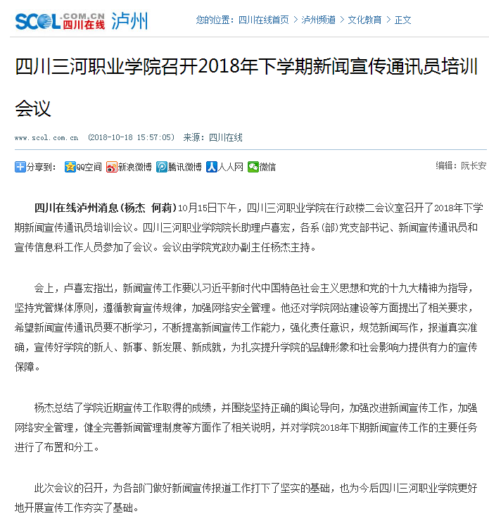 四川在线:四川三河职业学院召开2018年下学期新闻宣传通讯员培训会议