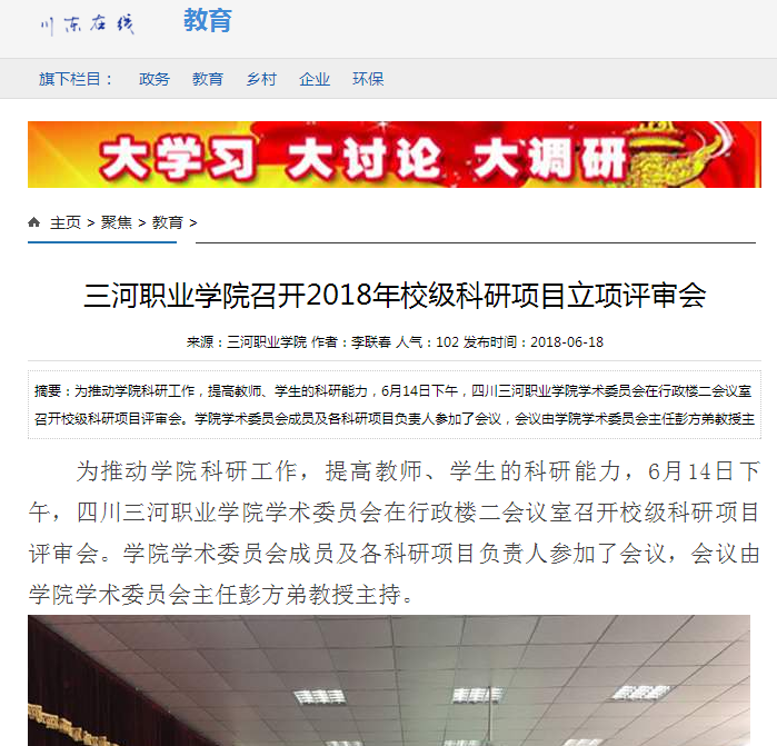 川东新闻网、川东在线:三河职业学院召开2018年校级科研项目立项评审会