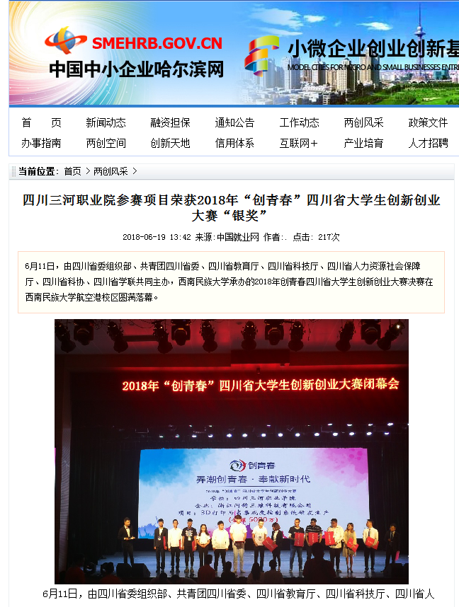 中国中小企业哈尔滨网:四川三河职业院参赛项目荣获2018年“创青春”四川省大学生创新创业大赛“银奖”