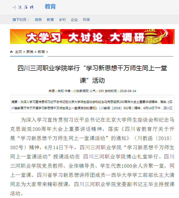 川东新闻网、川东在线:四川三河职业学院举行“学习新思想千万师生同上一堂课”活动