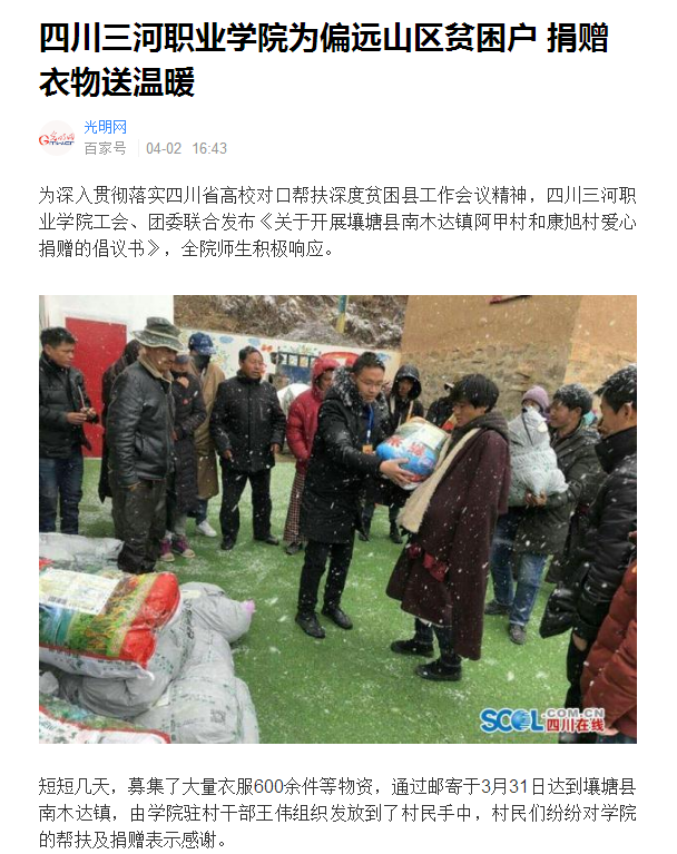 光明网百家号:四川三河职业学院为偏远山区贫困户 捐赠衣物送温暖