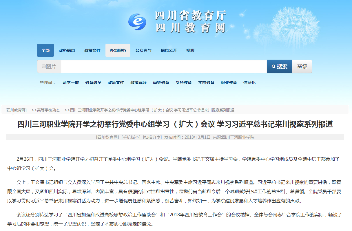 四川省教育厅官网: 四川三河职业学院开学之初举行党委中心组学习 (扩大)会议 学习习近平总书记来川视察系列报道