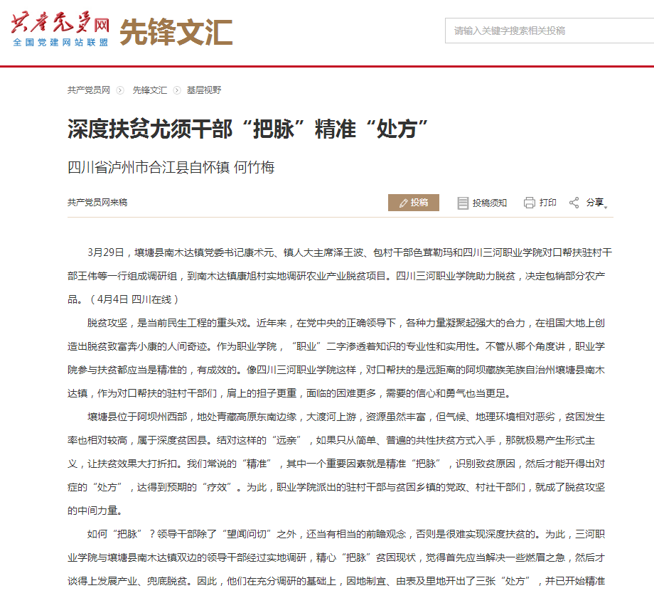 共产党员网:深度扶贫尤须干部“把脉”精准“处方”评四川三河职业学院扶贫工作