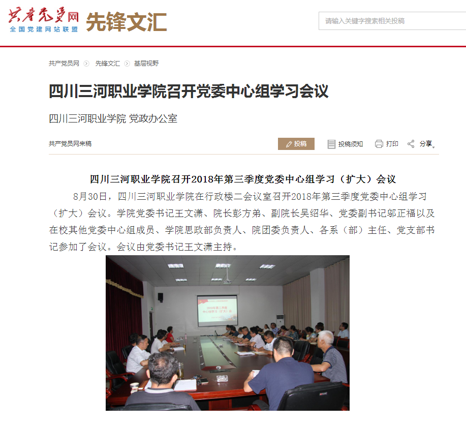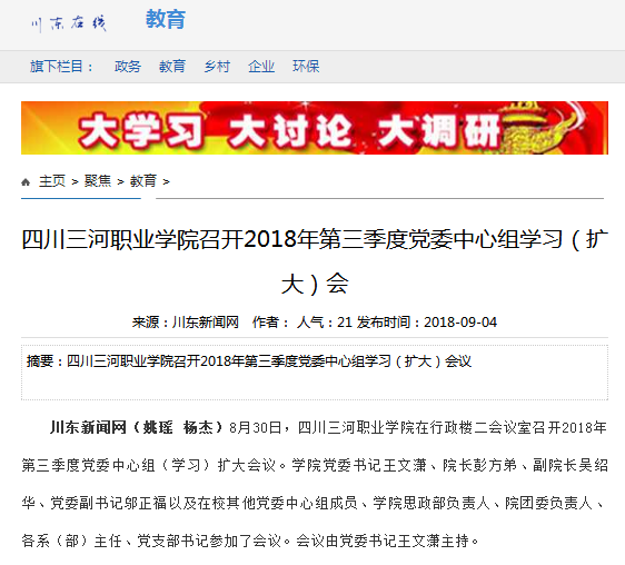 川东新闻网、川东在线:四川三河职业学院召开2018年第三季度党委中心组学习(扩大)会议