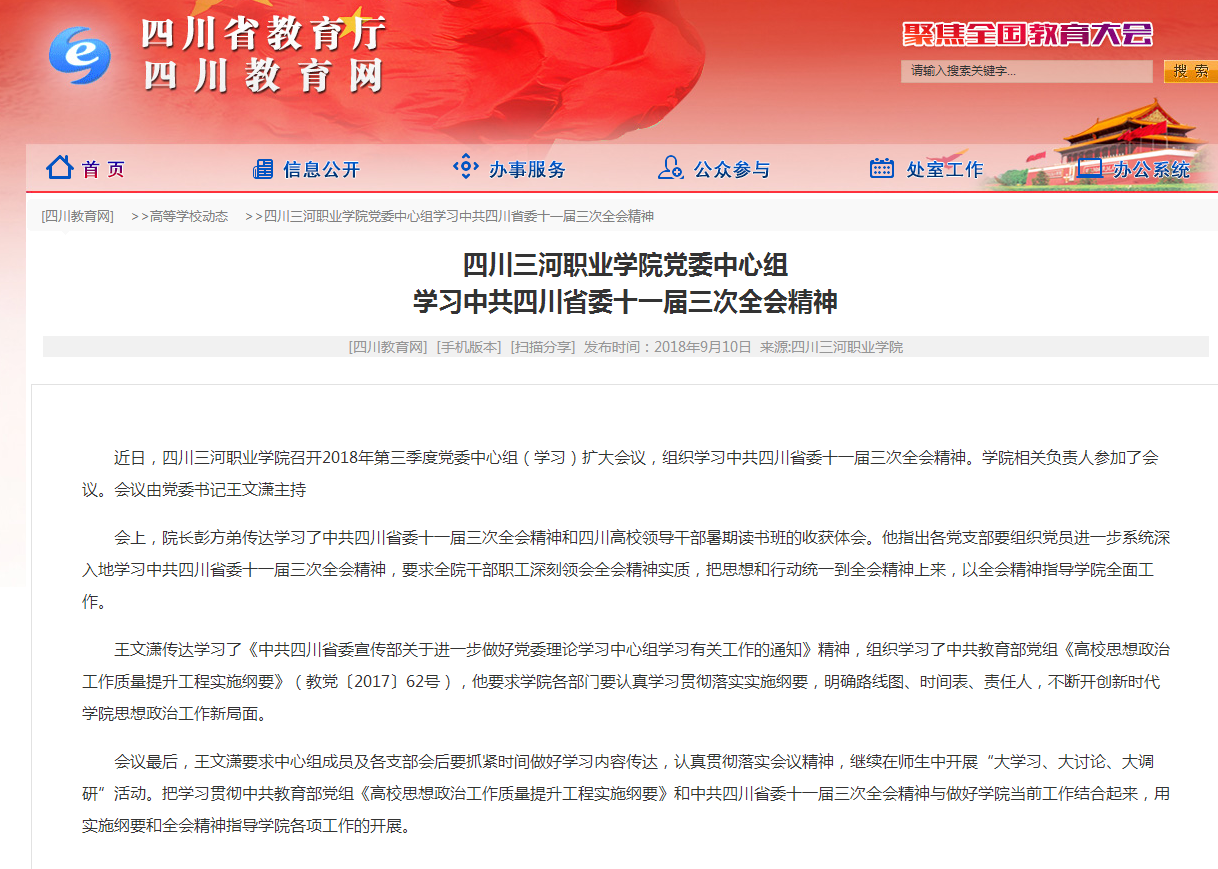 四川省教育厅官网:四川三河职业学院党委中心组 学习中共四川省委十一届三次全会精神