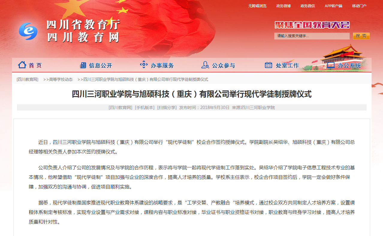 四川省教育厅官网:学院与旭硕科技(重庆)有限公司举行现代学徒制授牌仪式