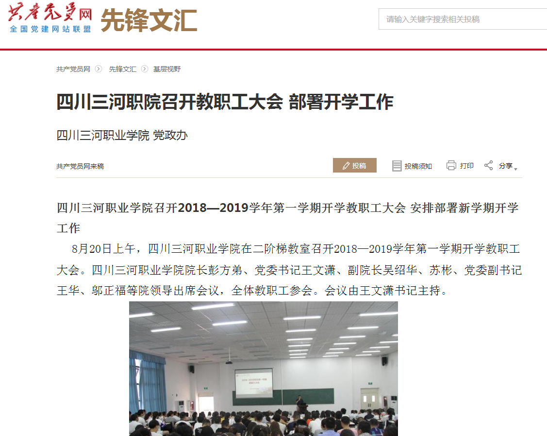 共产党员网:四川三河职业学院召开2018—2020学年第一学期开学教职工大会 安排部署新学期开学工作