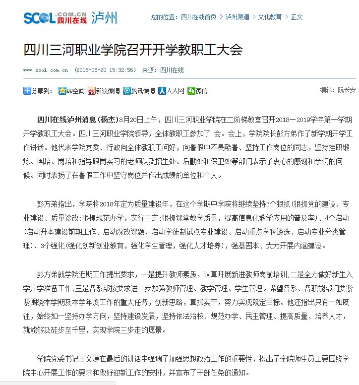 四川在线:四川三河职业学院召开开学教职工大会