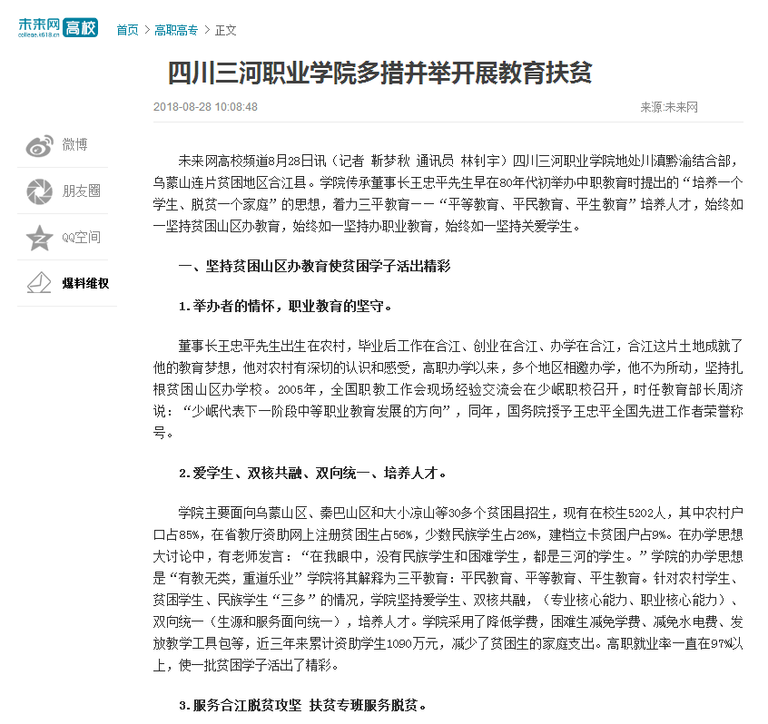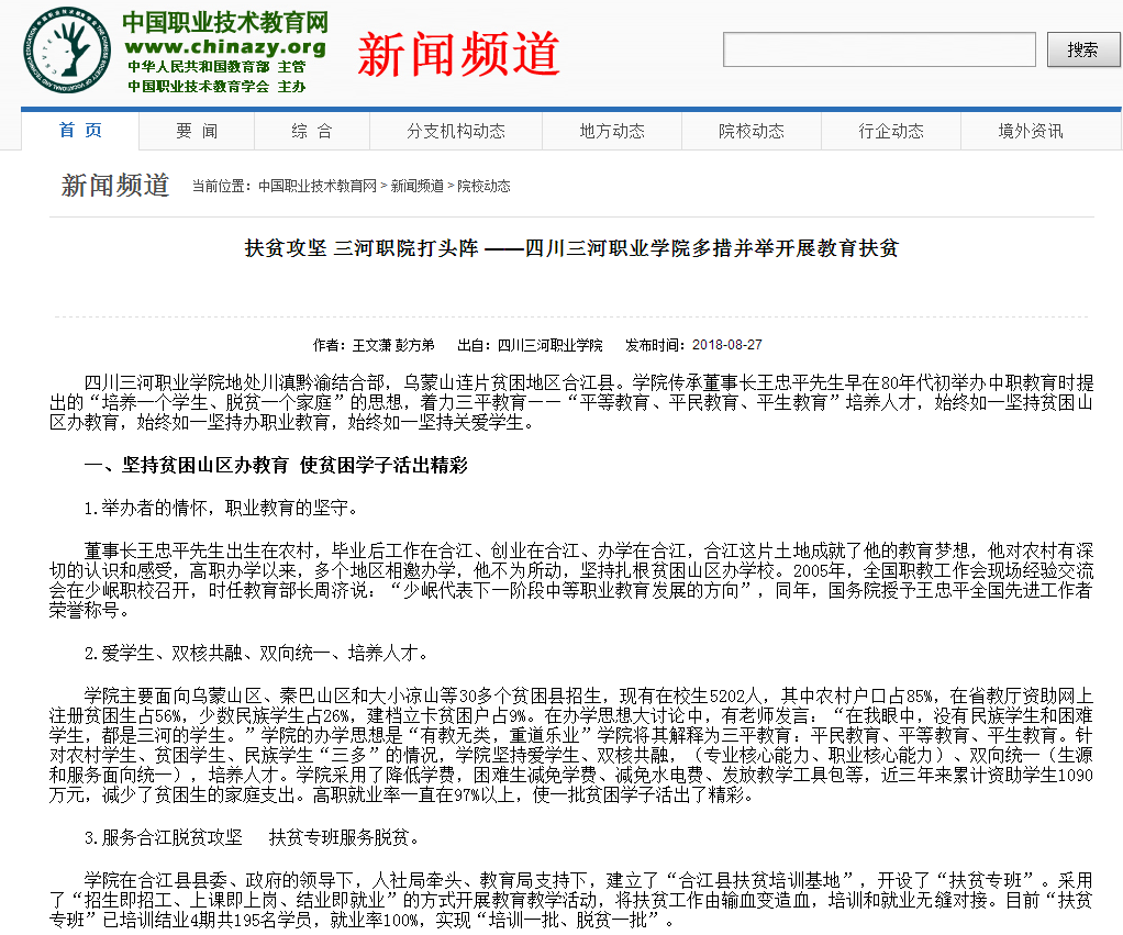 中国职业技术教育网:扶贫攻坚 三河职院打头阵 ——四川三河职业学院多措并举开展教育扶贫