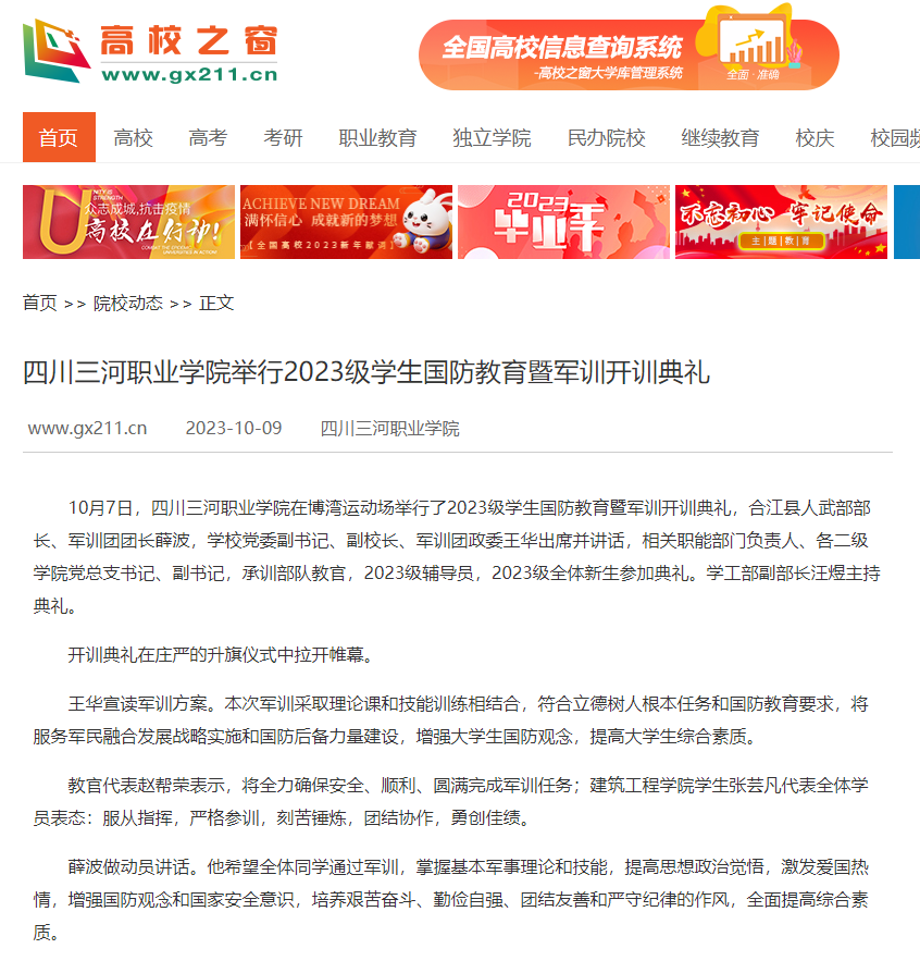 中国高校之窗:四川三河职业学院举行2023级学生国防教育暨军训开训典礼