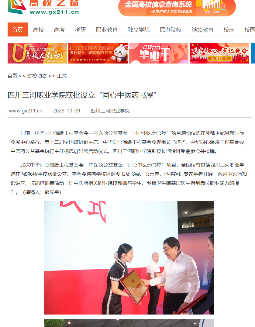 中国高校之窗:四川三河职业学院获批设立“同心中医药书屋”