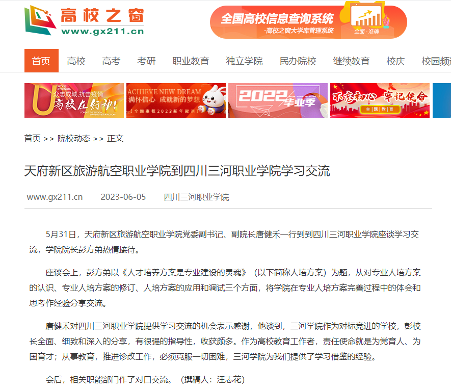 中国高校之窗:天府新区旅游航空职业学院到四川三河职业学院学习交流