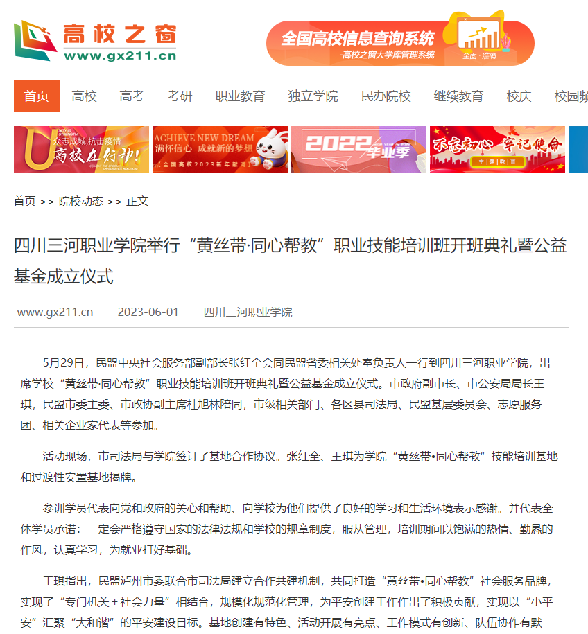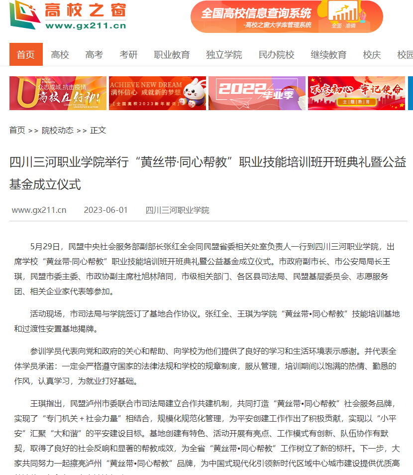 中国高校之窗:四川三河职业学院举行“黄丝带·同心帮教”职业技能培训班开班典礼暨公益基金成立仪式