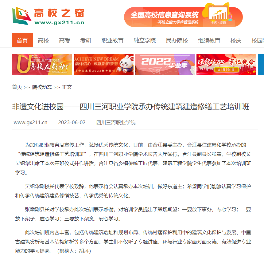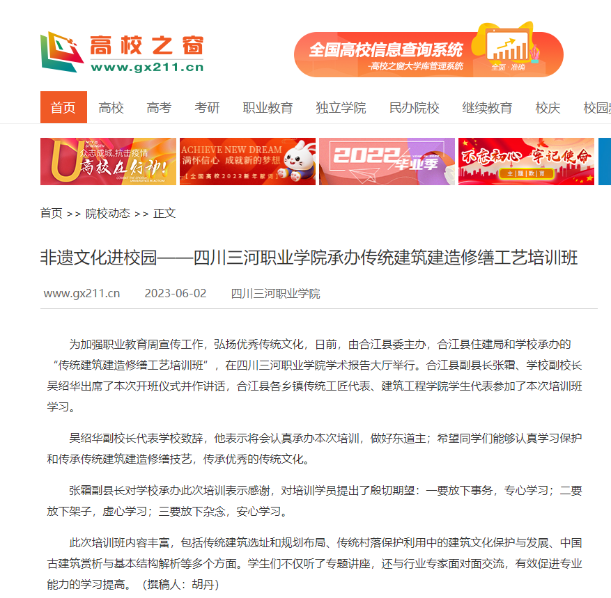 中国高校之窗:非遗文化进校园——四川三河职业学院承办传统建筑建造修缮工艺培训班