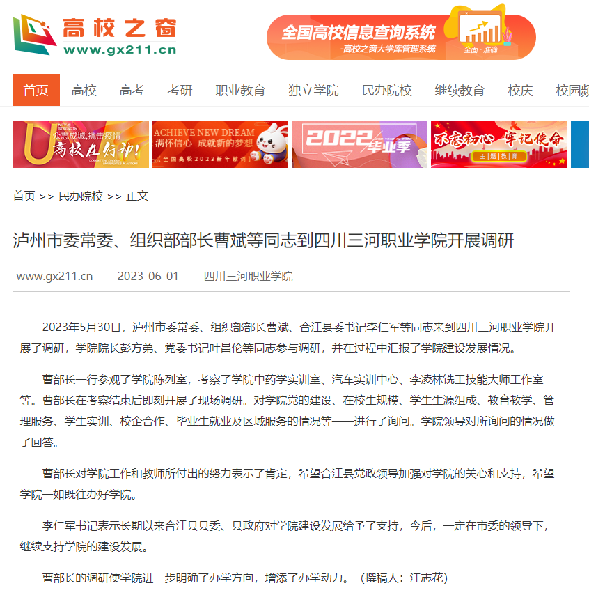 中国高校之窗:泸州市委常委、组织部部长曹斌等同志到四川三河职业学院开展调研